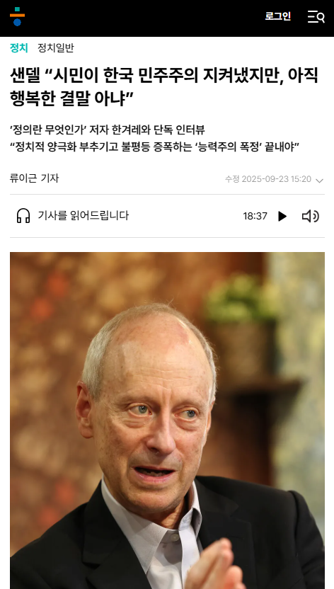 <정의는 무엇인가>로 유명한 마이클 샌덜 교수의 인터뷰를 소개합니다. 그는 한국의 민주주의 회복을 언급하며, 놀랍지만 아직 완전하지 않다고 말합니다. 그의 발언을 요약합니다.